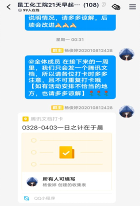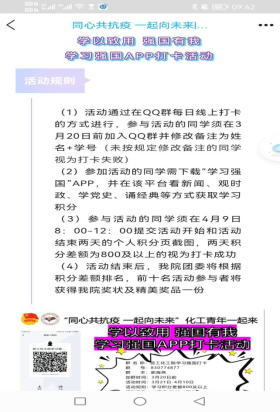 本次系列活动包含“一日之计在于晨”——21天早起打卡活动、“学以致用,强国有我”——学习强国APP打卡活动、“我是食堂支持者”——校内就餐光盘打卡活动和“青春爱运动,健康强中国”——校园跑步线上打卡活动,通过QQ群、微信小程序和学习强国APP等平台以线上的形式开展,并结合学院特色,以第二课堂积分和文创奖品作为奖励鼓励化工青年积极参加。本次活动化工院共309人参加,打卡成功率达45.3%,颁发奖状及奖品共65份。