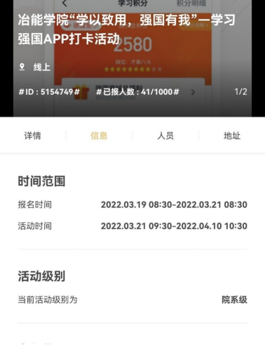 为深入学习贯彻习近平新时代中国特色社会主义思想,营造浓厚校园学习氛围,2022年3月21日至4月10日,冶金与能源工程学院举办“学以致用,强国有我”学习强国线上打卡活动。