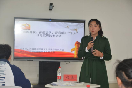 4月11日18:30,法学院在明理楼311教室举办“强国有我,奋进法学,青春献礼二十大”宣讲比赛。此次比赛邀请了研究生工作部赵佳老师、学校博硕宣讲团团长以及骨干成员作为评委,法学院众多学生踊跃参与。