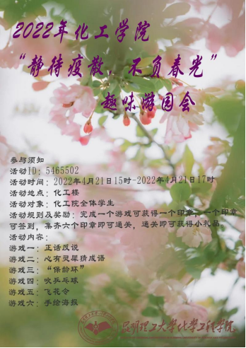 2022年4月21日15点,化学工程学院在化工楼前空地开展了“静待疫散,不负春光”趣味游园会。